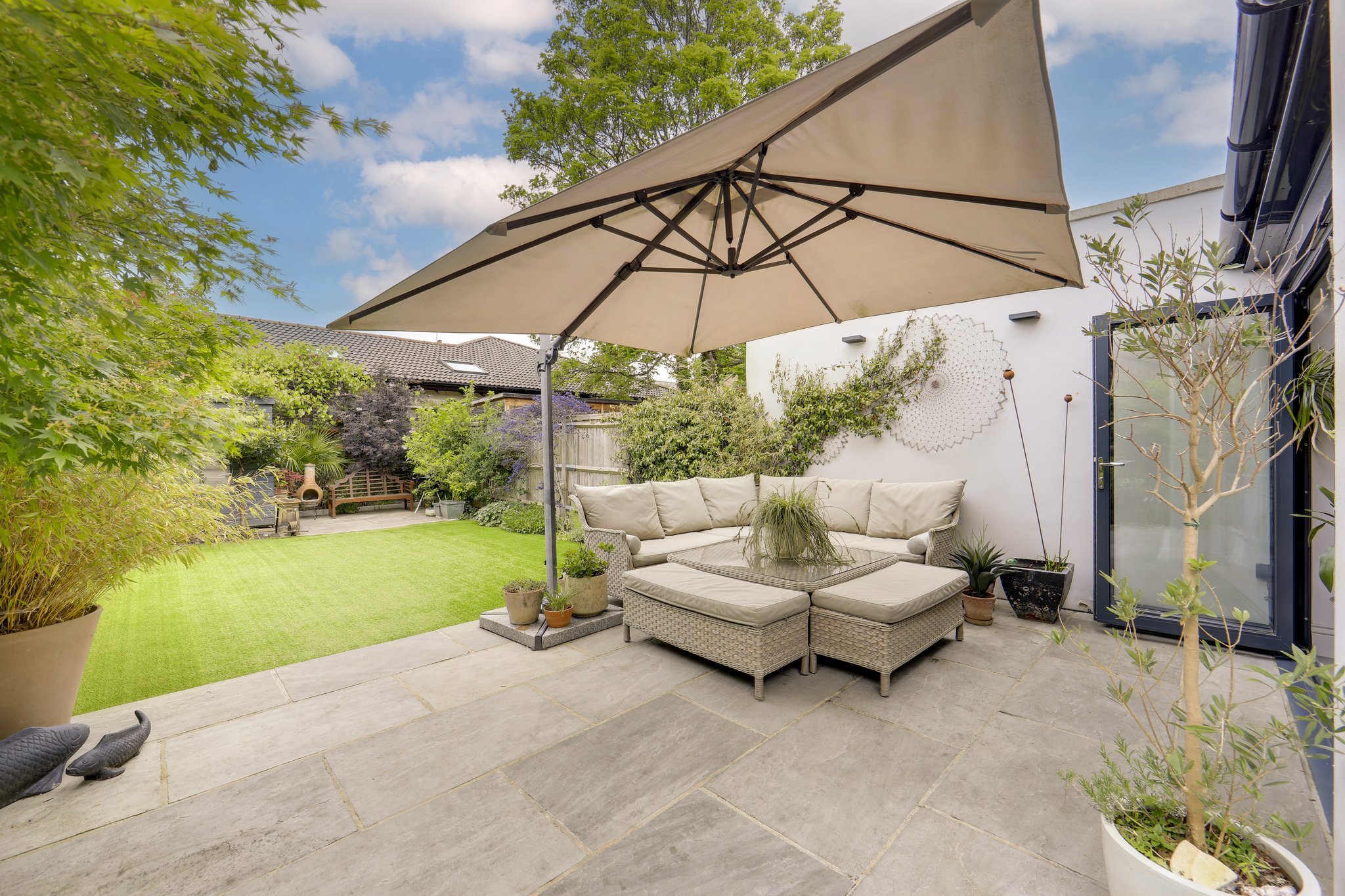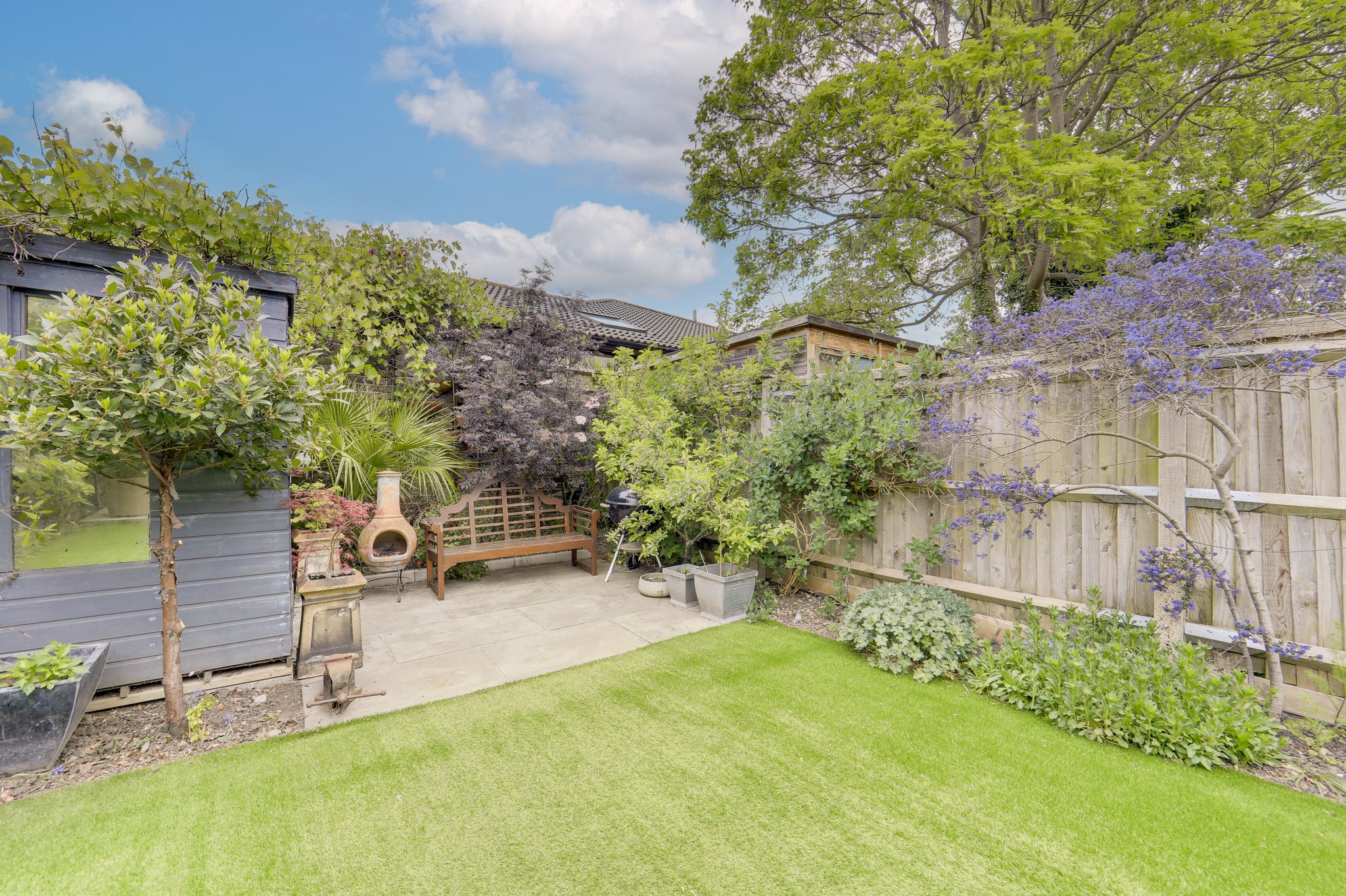 Outside, a carefully landscaped, low-maintenance, rear garden unfolds with distinct zones for dining and lounging. Mature planting and paved seating areas, particularly the rear 'sun-trap' patio, make it an ideal secluded haven whilst also being perfect to house summer gatherings. There's also a handy garden shed perfect for storage.