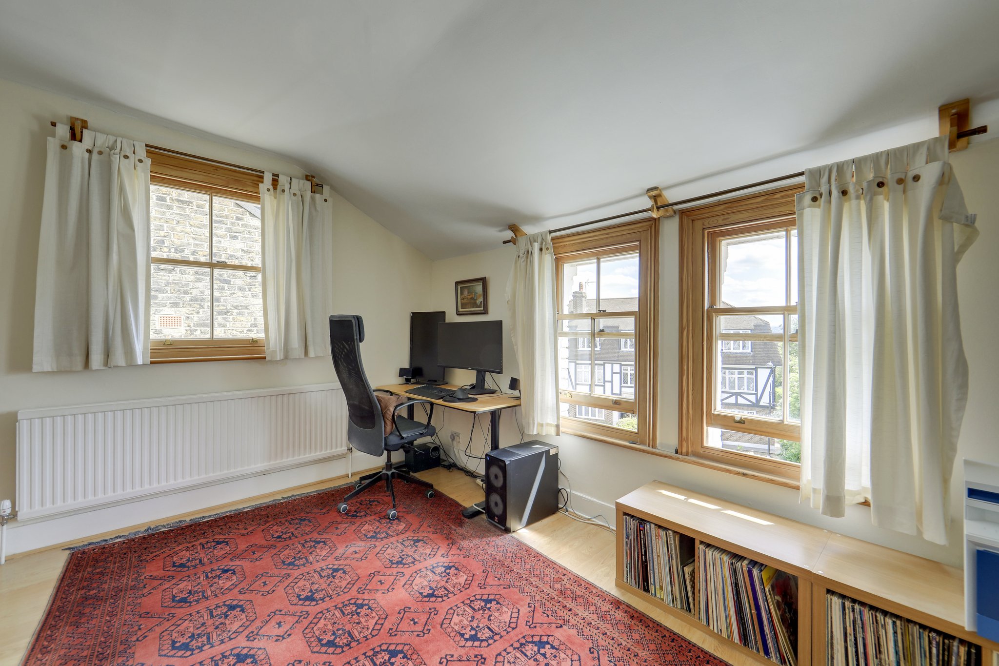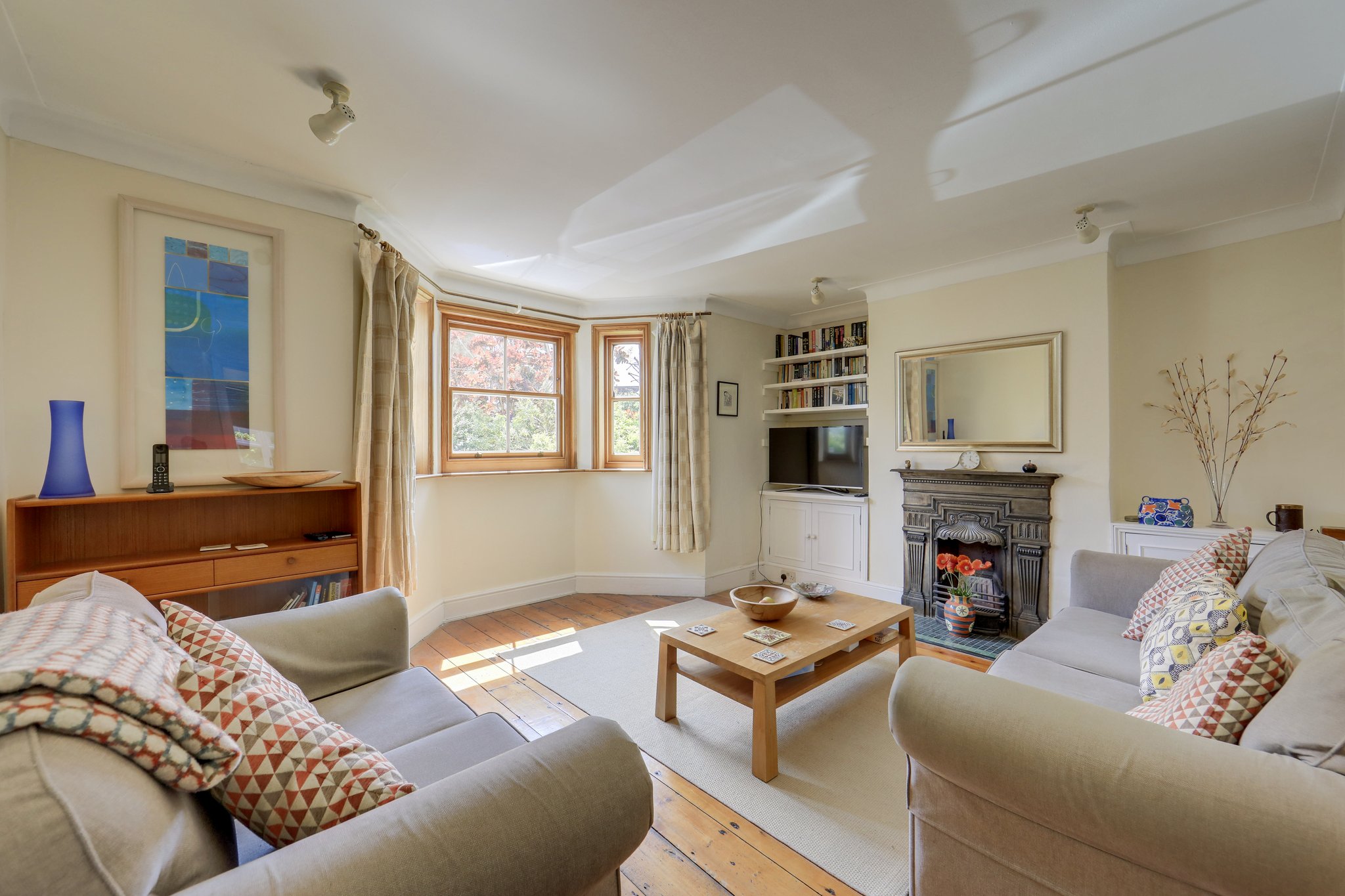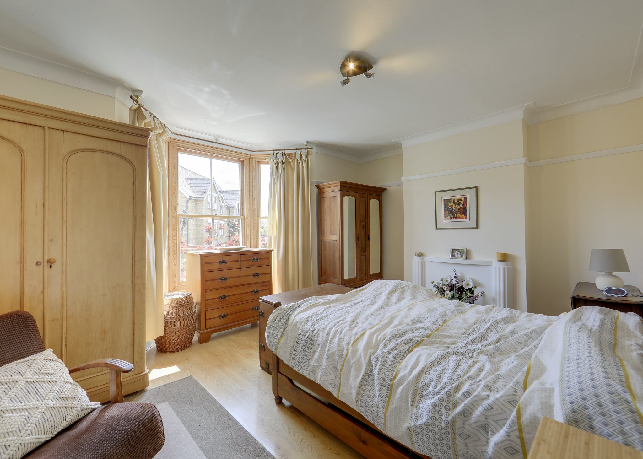 Upstairs, the first floor hosts a generous principal bedroom with a striking bay window, alongside a second double bedroom overlooking the garden. Both are served by a well-appointed shower room. The top floor features two further double bedrooms, each with built-in wardrobes and ample natural light, as well as a family bathroom.