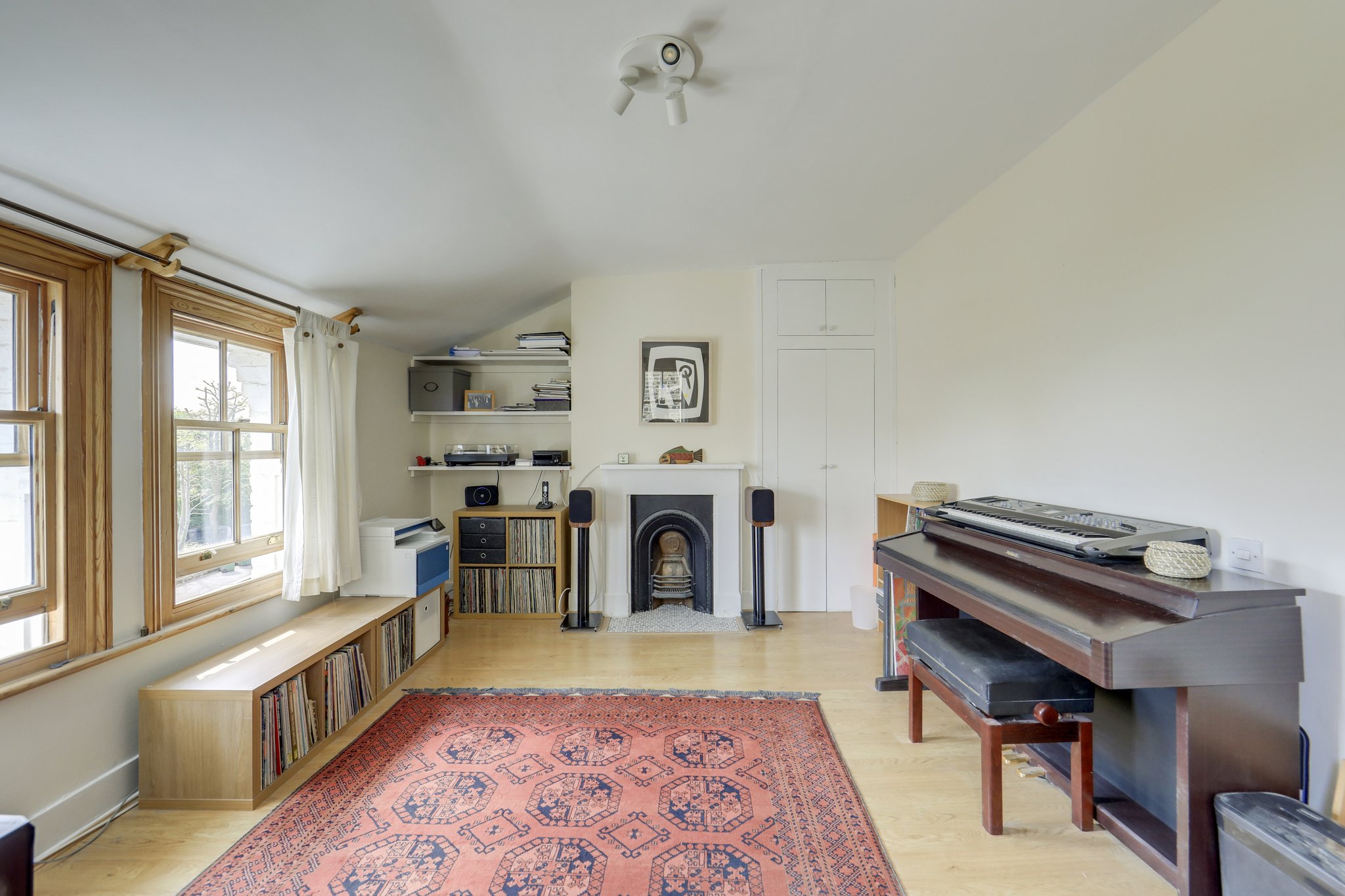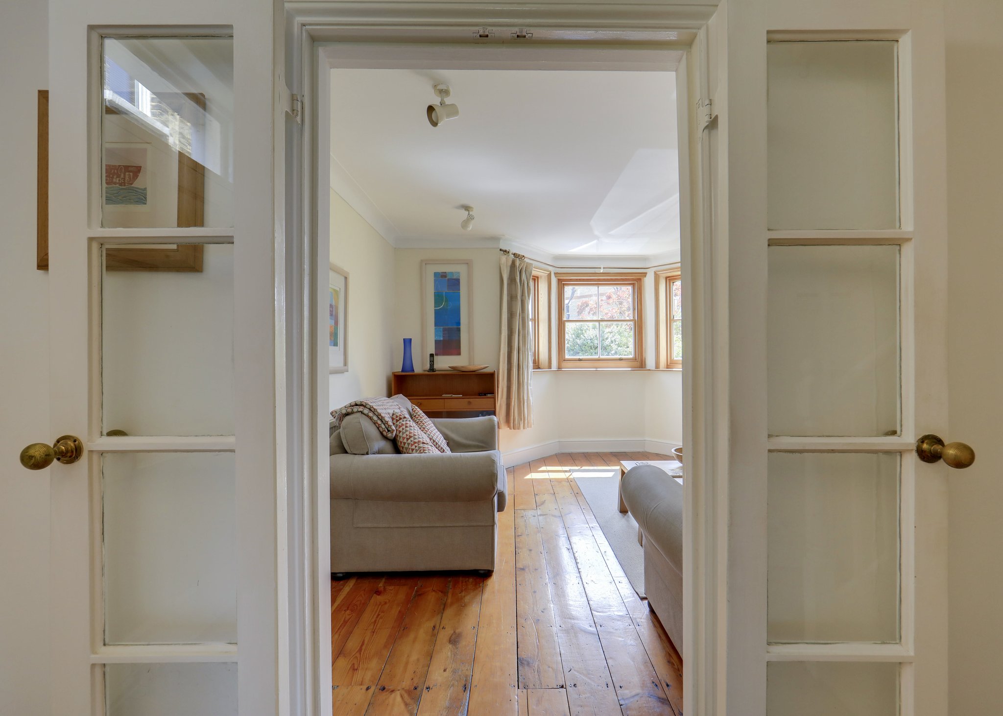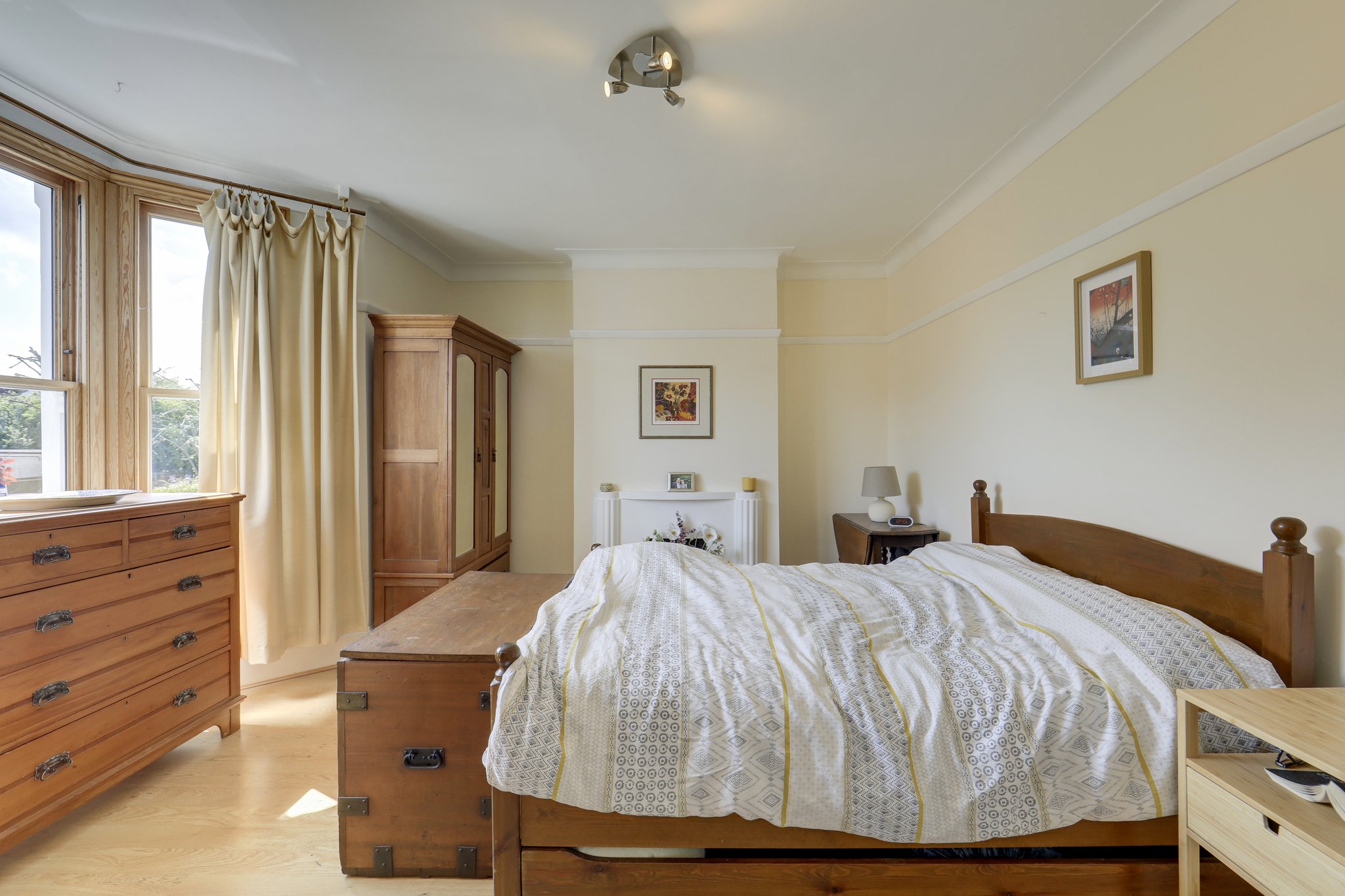 Upstairs, the first floor hosts a generous principal bedroom with a striking bay window, alongside a second double bedroom overlooking the garden. Both are served by a well-appointed shower room. The top floor features two further double bedrooms, each with built-in wardrobes and ample natural light, as well as a family bathroom.