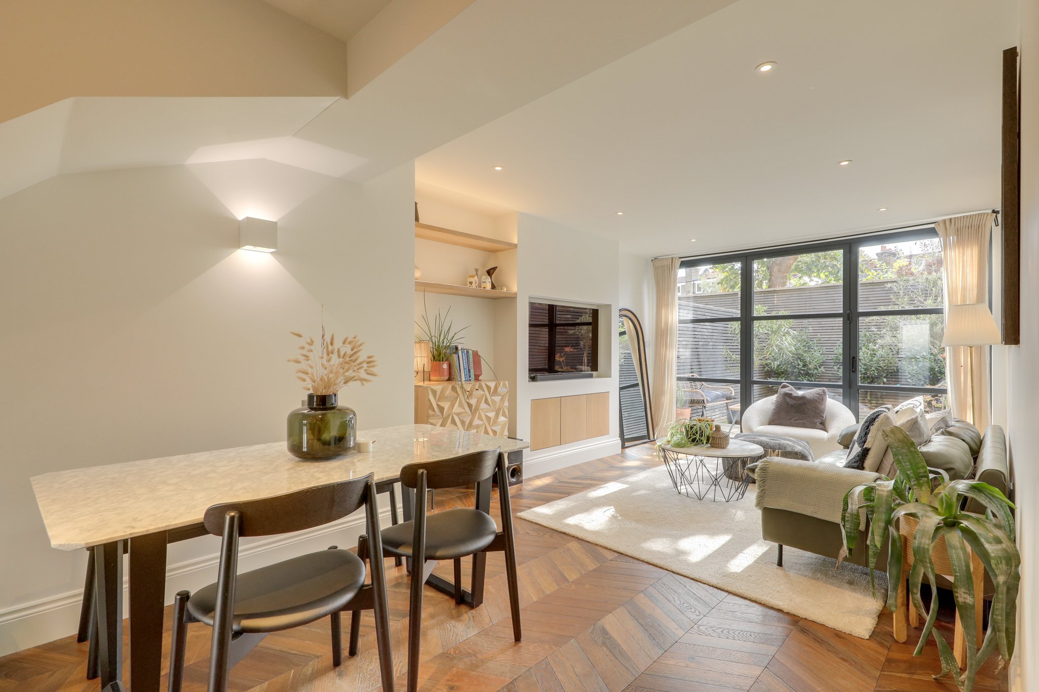 This property offers a generous, open-plan living space that has been finished to an exceptional standard, equipped with an array of bespoke joinery, architectural detailing, and top-of-the-range appliances. The lounge area boasts luxurious herringbone walnut engineered wood flooring, setting a tone of sophisticated comfort. The gourmet kitchen is a chef's delight, featuring sleek quartz work surfaces and a cutting-edge Quooker tap for instant boiling water. Throughout the house, a comprehensive suite of smart solutions has been integrated, including a hive system that controls both heating and lighting, offering effortless modern living.
