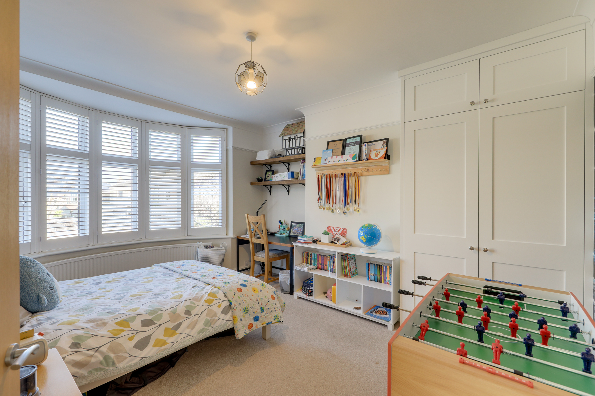 Pendant light, double-gazed bay window with fitted shutters, built-in wardrobe storage, radiator, carpet.