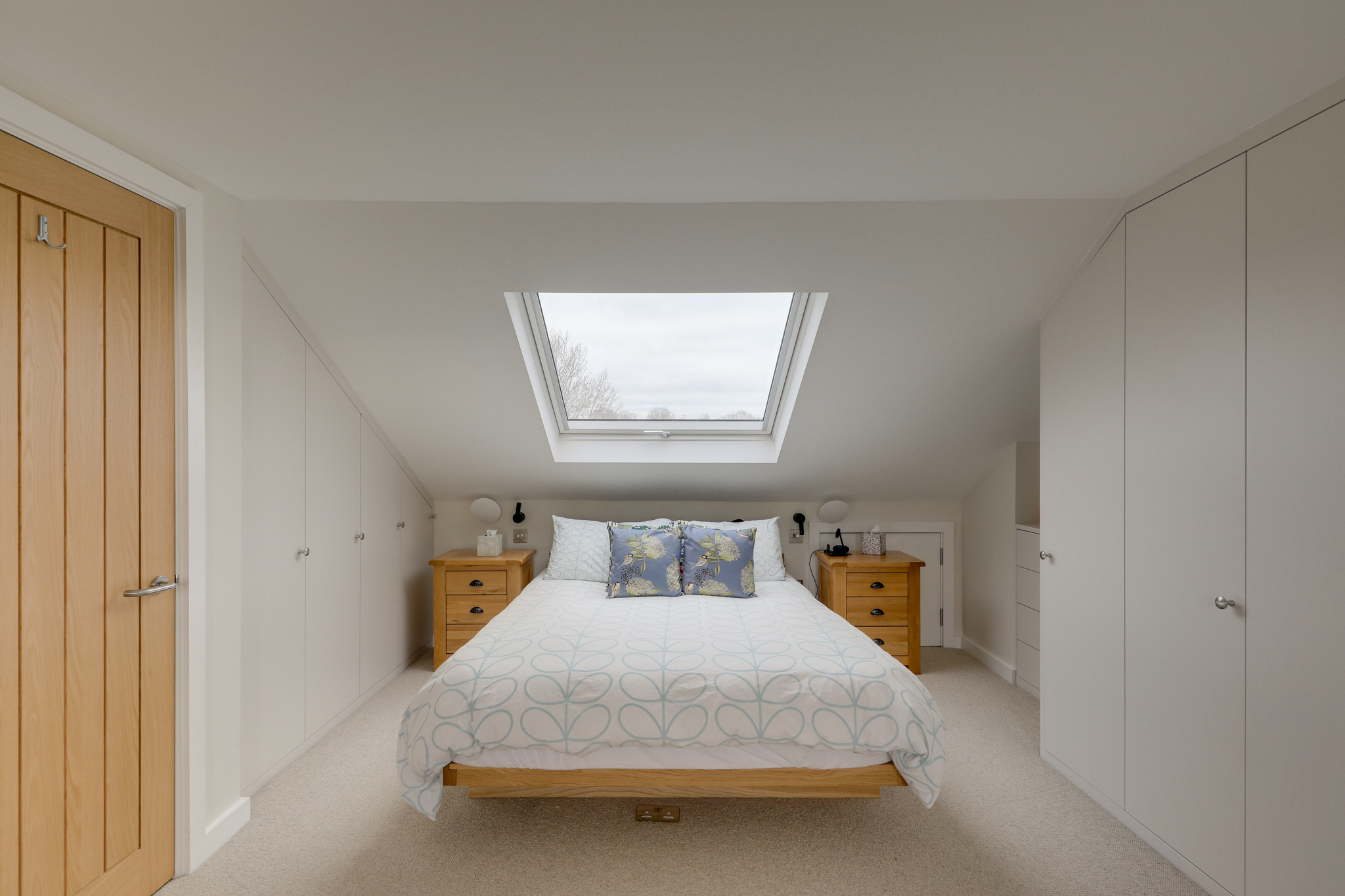 Lighting, sky light window, double-glazed door leading to balcony, eaves storage, fitted wardrobe storage, radiator, carpet.