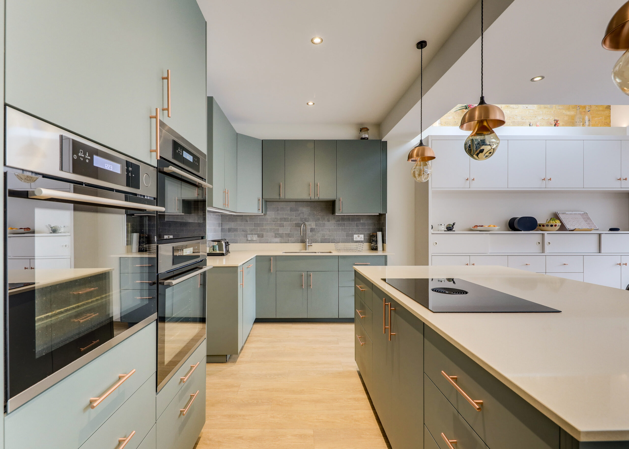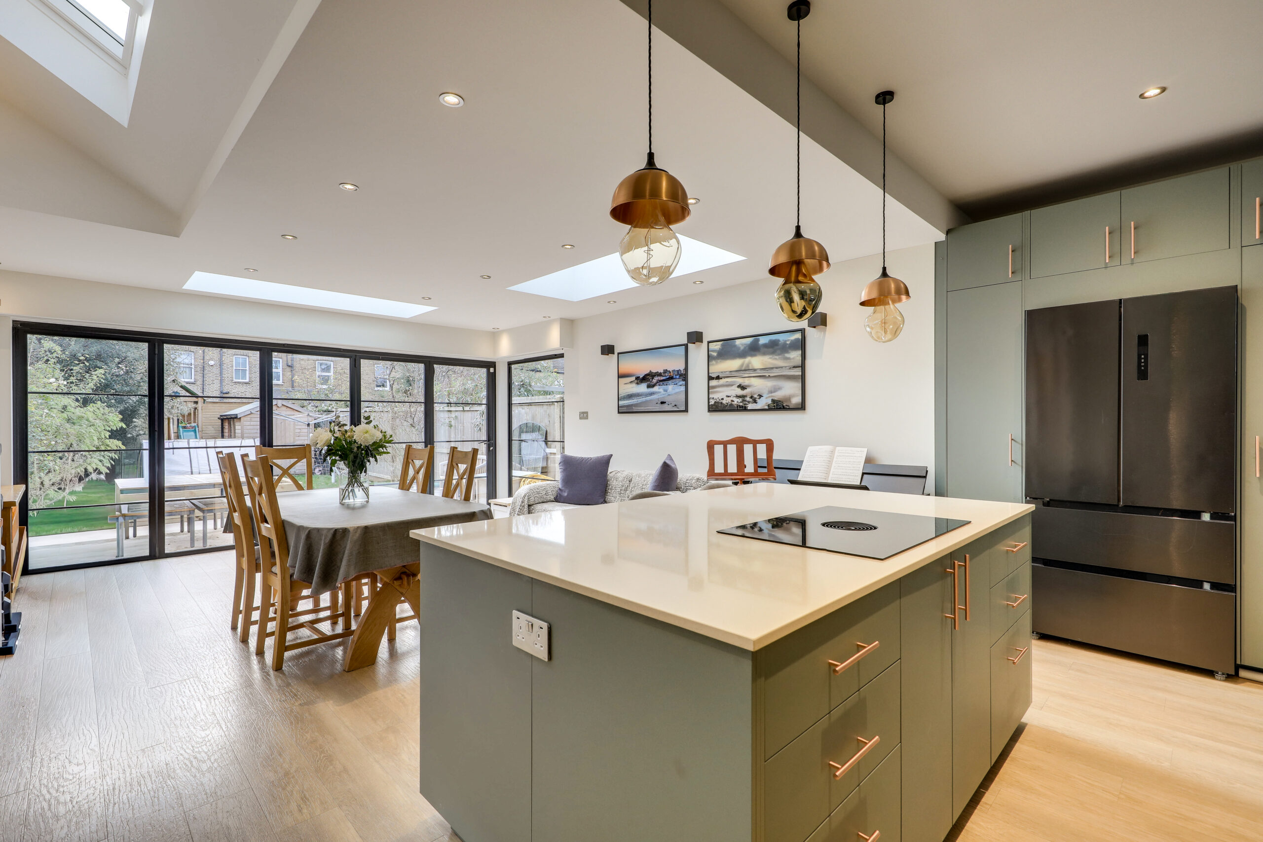 Pendant lights, spotlights, sky light windows, double glazed windows with patio door, matching fitted counter and wall units, island storage counters, integrated hob and oven cooker, stainless steel sink with mixer tap, integrated wine fridge, ample storage, underfloor heating, amtico.