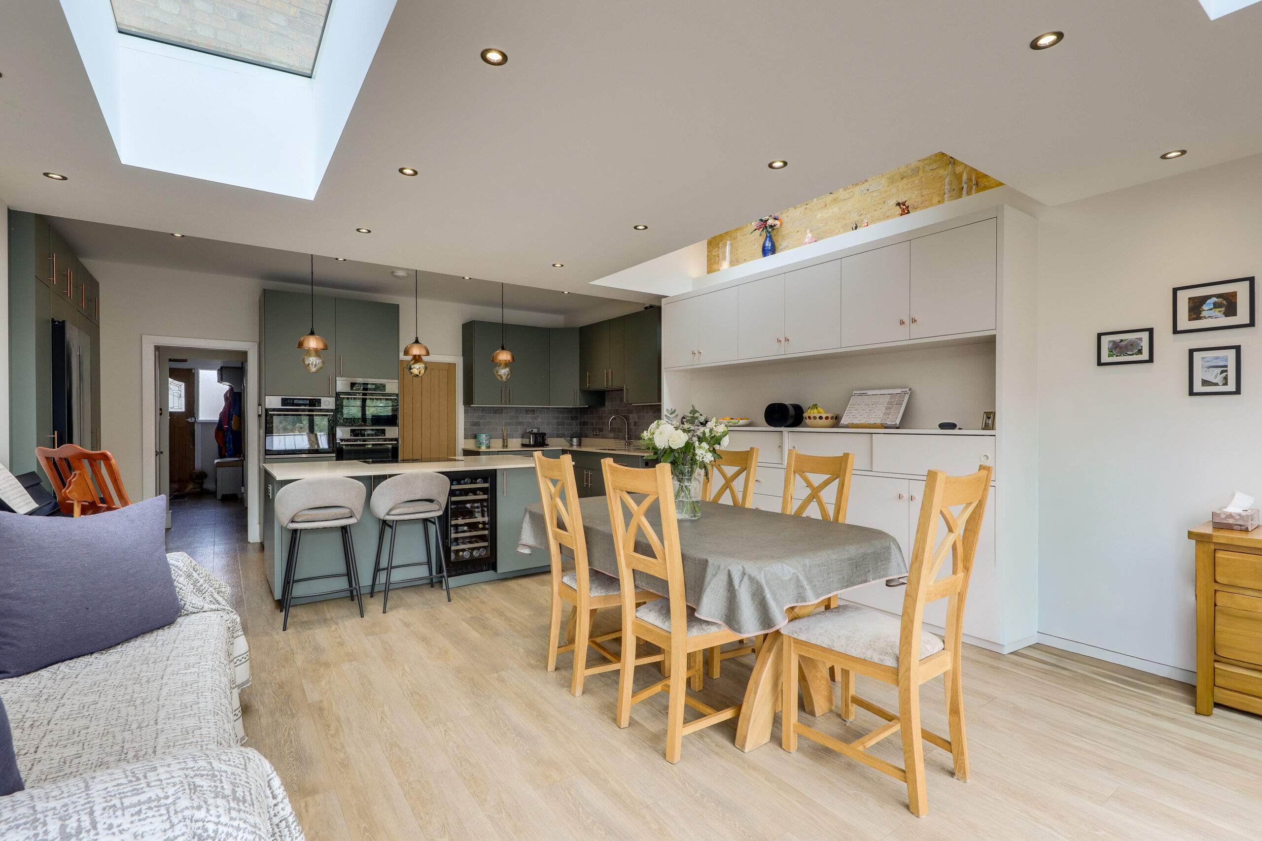 The ground floor has been thoughtfully composed to support modern living. At the rear, an open-plan kitchen and dining room forms the bright, uplifting heart of the home, with expansive glazing that draws in natural light and frames serene garden views. To the front, a welcoming living room offers a peaceful retreat, while a well-appointed utility room and discreet guest W/C introduce valuable everyday practicality.